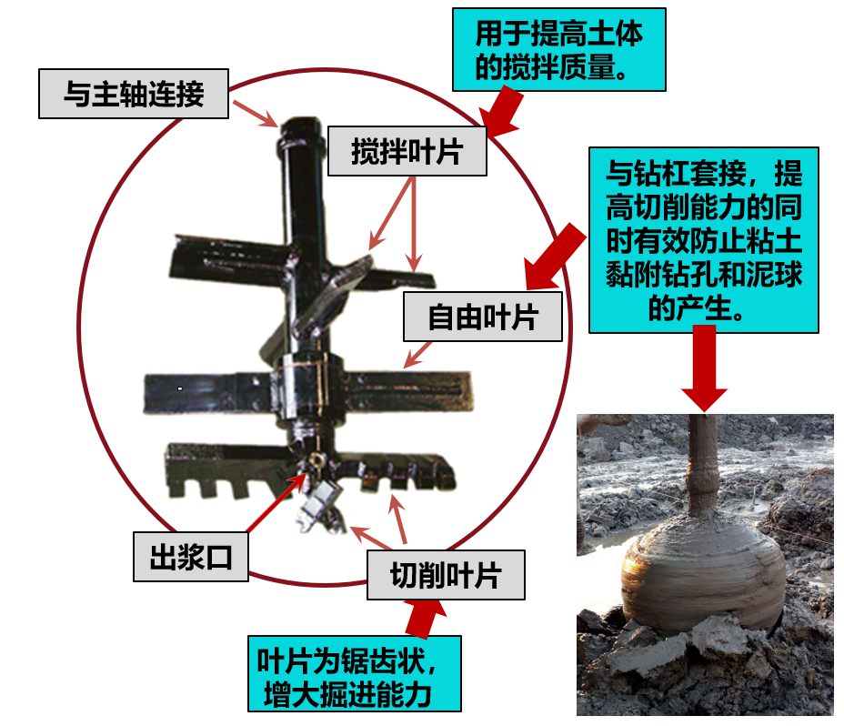 此外,IMS工法機的加固質(zhì)量好,IMS工法高質(zhì)量的攪拌與鉆頭的特殊構造是分不開的。鉆頭的最下方是切削葉片,它是鋸齒狀的,主要作用是增加整個鉆頭的掘進能力,在轉動的同時減少對周圍土體的拖帶作用,出漿口也設置在切削葉片上,當成樁直徑小于1m時,采用單出漿口注漿,樁徑大于1m時,則采用雙出漿口注漿。第二道是自由葉片,整個鉆桿在轉動的同時,自由葉片不參與旋轉,主要作用是為了防止粘性土黏附鉆桿產(chǎn)生泥球。最上部是十字形的攪拌葉片,葉片之間間距較小,可以充分提高土體攪拌質(zhì)量。