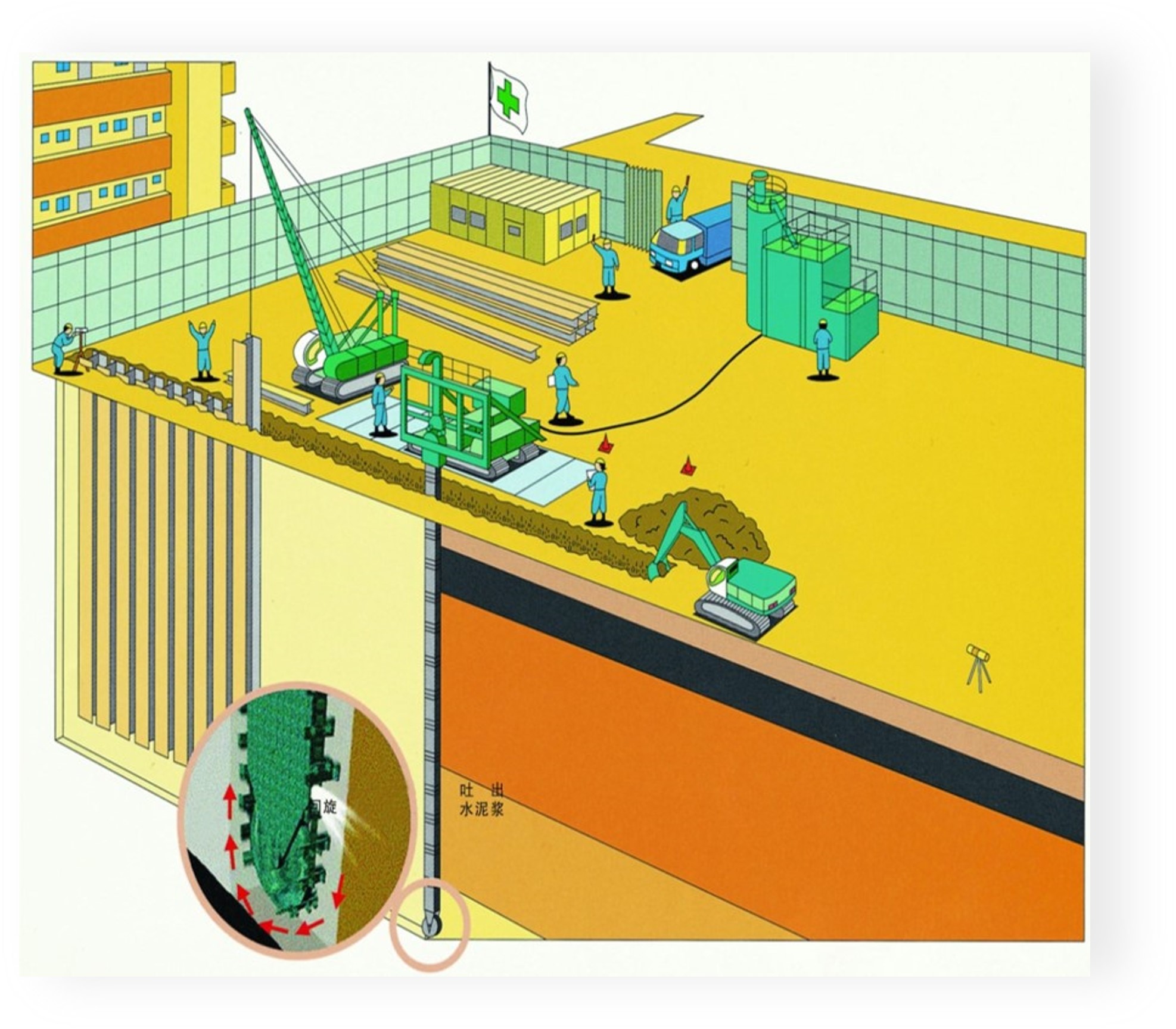 連續(xù)性刀鋸向垂直方向一次性的挖掘, 混合攪拌及橫向推進(jìn), 在復(fù)雜地層也可以保證均一質(zhì)量的地下連續(xù)墻。