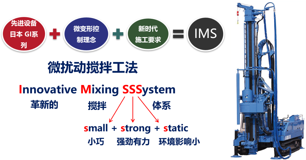 IMS工法(Innovative Mixing System)的中文名叫微擾動攪拌工法,這種工法以日本YBM公司研發生產的GI系列設備為施工主體,結合現代化的施工工藝和要求,響應施工過程中的微變形控制理念,代表的是一種革新的攪拌體系,具有功率大、重量輕、施工空間小、施工效率高、施工質量高、對土體擾動小等顯著優點。