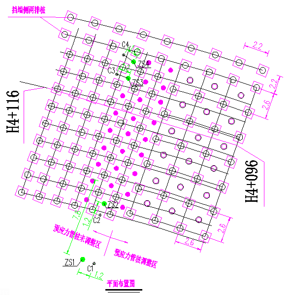 本項目為杭州留下高速互通改建工程,場地位于留下互通H4匝道橋H4+096~H4+116。其中,IMS工法樁位于H4+104~H4+110,設計加固的深度根據不同的對象采用不同的加固深度。本設計基底加固有效樁長均為8米~13米,設置于原預應力管樁中心。如圖8~圖14所示。