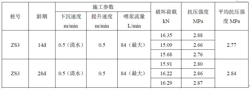(2)樁身強度在14d和28d齡期時都超過了2.5MPa的高強度,成樁質量好。