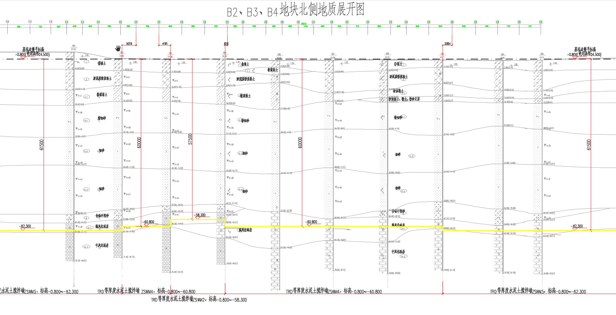 本基坑工程處于長江岸邊500m范圍內,為確保長江汛期基坑工程安全可靠以及順利實施,本工程對B2、B3、B4地塊周邊采用TRD等厚度水泥土攪拌墻作為落底式隔水帷幕隔斷基坑內外地下水聯系。