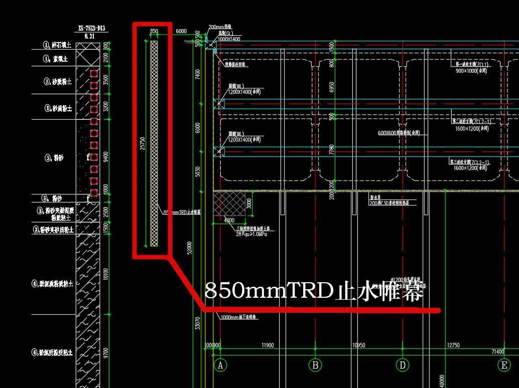 TRD工法通過水平橫向運動成墻,可形成沒有接口的等厚連續墻體,其止水防滲效果遠遠優于柱列式地下連續墻和柱列式攪拌樁加固,其主要特點是環境污染小、成墻連續、表面平整、厚度一致、墻體均勻性好、防滲性能好、施工安全,與傳統柱列式地下連續墻相比隔滲,經濟性好。
