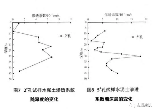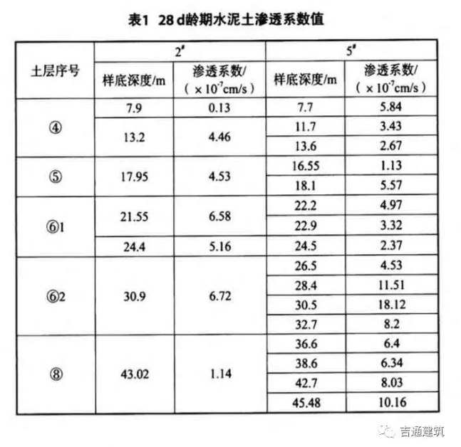 從滲透系數(shù)范圍可以推測:在黏土、粉土、以及粉質(zhì)黏土層范圍內(nèi),經(jīng)TRD工法作用,使該范圍土層得到充分攪拌,上下基本均勻一致,未出現(xiàn)黏土成塊和局部漿液富集的現(xiàn)象,水泥攪拌土結(jié)構(gòu)致密。經(jīng)試驗分析,水泥攪拌土滲透系數(shù)均在10^(-7)數(shù)量級,同土層施工效果的平均性較好。