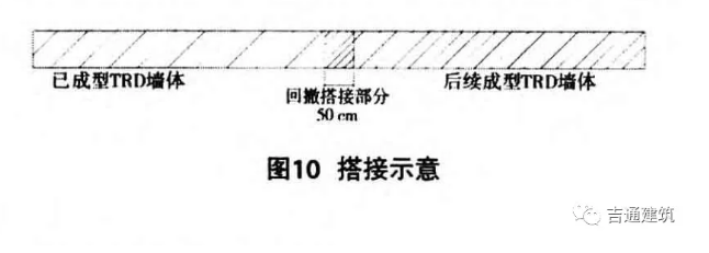 (g)成墻搭接,新老墻體區(qū)域搭接質(zhì)量要嚴格控制,尤其是挖掘和攪拌速度,使土體中混合泥漿與固化液充分攪拌和混合。搭接寬度宜控制在50cm左右(圖10)。