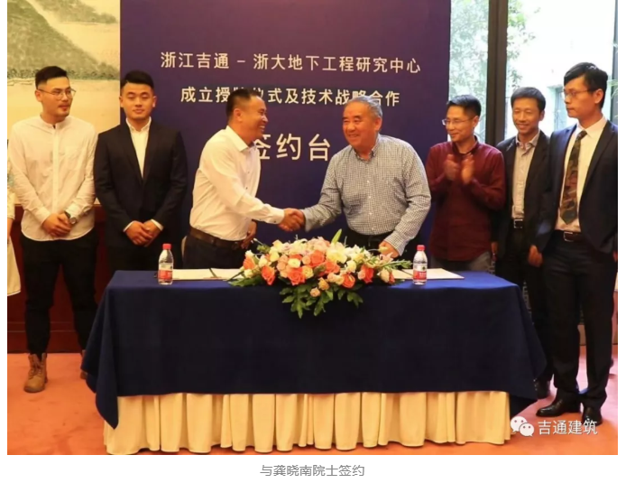 會議首先舉行浙江吉通—浙大地下工程研究中心成立授牌簽約儀式、浙江吉通地空建筑科技有限公司董事長江正兵、浙江大學濱海和城市巖土工程研究中心主任龔曉南院士進行簽約、并由龔曉南院士進行研究中心授牌。這標志著浙江吉通在施工技術研發和應用方面又邁出堅實的一步。